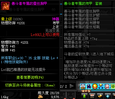 | 鬼剑士 | 神枪手 | 格斗家 | 魔法师 | 圣职者 | 暗夜使者 | 布甲 | 皮甲 | 重甲 | 轻甲 | 板甲 | 饰品 |