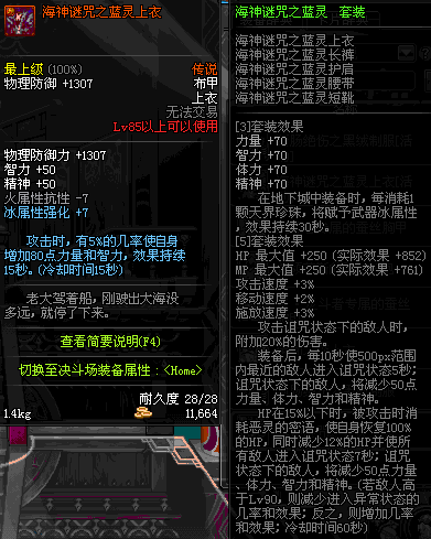 | 85 | 海神谜咒之蓝灵上衣 | *昨日之巴斯顿 掉落 (在远古地下城里出没。) *从NPC鲁特的物品店出售的[海神谜咒防具礼盒]中获得 *船长鲁特 出售 (深海诅咒 : 解咒法×600) |