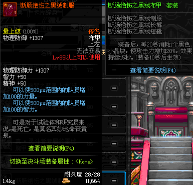 | 85 | 断肠绝伤之黑绒制服 | *昨日之巴斯顿 掉落 (在远古地下城里出没。) *从NPC鲁特的物品店出售的[断肠绝伤防具礼盒]中获得 *任务奖励(地下城:比尔马克帝国试验场 NPC娜塔莉娅·休勒) |