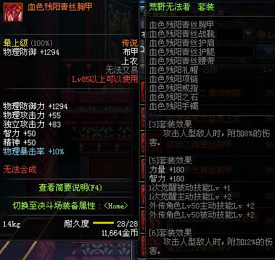 | 85 | 血色残阳青丝胸甲 | *昨日之巴斯顿 掉落 (在远古地下城里出没。) *从NPC鲁特的物品店出售的[血色残阳防具礼盒]中获得 |