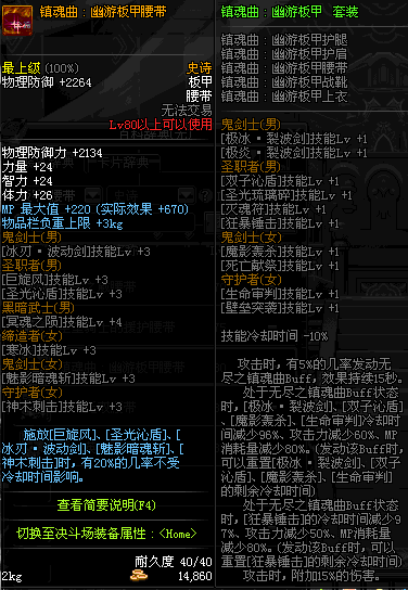 | 80 | 镇魂曲:幽游板甲腰带 | *Lv79~86深渊地下城怪物掉落 | 镇魂曲 : 幽游板甲 套装 | |