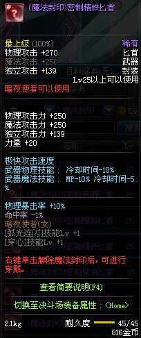 | 25 | (魔法封印)密制精铁匕首 | *Lv24~31普通地下城怪物掉落 *在NPC阿尔伯特·伯恩斯坦的物品店购买 *完成[帝国的险恶用心]任务 *使用Lv24~31怪物掉落的设计图进行制作 |