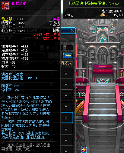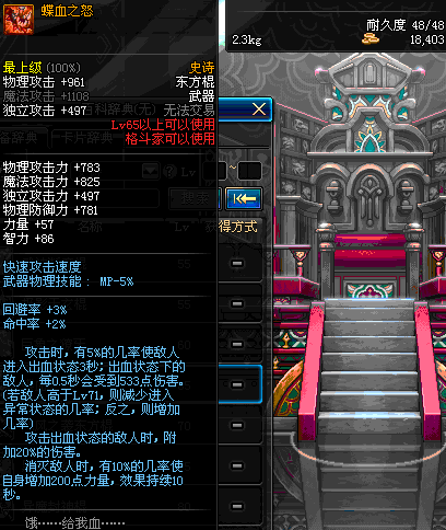 | 65 | 蝶血之怒 | *Lv64~71深渊地下城怪物掉落 *在NPC沉默之克雷娅的物品店购买 |