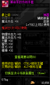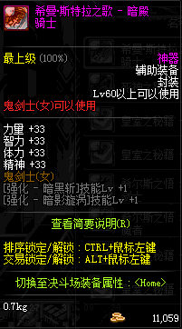 | 鬼剑士 | 神枪手 | 格斗家 | 魔法师 | 圣职者 | 暗夜使者 | 布甲 | 皮甲 | 重甲 | 轻甲 | 板甲 | 饰品 |