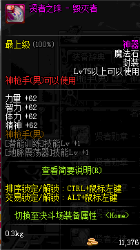 | 辅助装备: | 全职业 鬼剑士 女鬼剑 女格斗 男格斗 神枪手 女枪手 魔法师 男法师 圣职者 暗夜使者 守护者 |