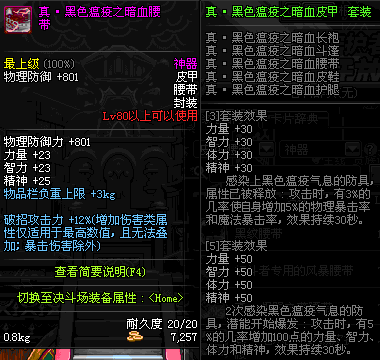 | 80 | 真 · 黑色瘟疫之暗血腰带 | *设计图(70LV以上普通地下城 登场的NPC加百利 出售) *黑色瘟疫之暗血腰带 → 用远古神器装备进化书升级(NPC船长鲁特 出售) |