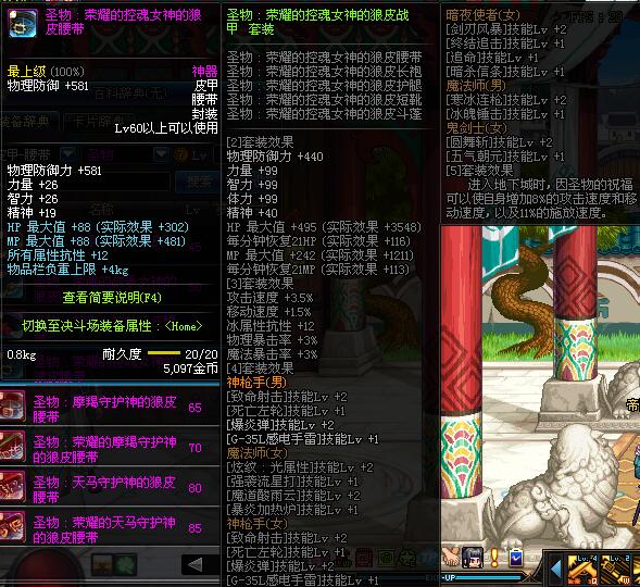 | 60 | 圣物 :荣耀的控魂女神的狼皮腰带 | *Lv58~66普通地下城怪物掉落 |