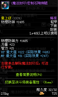 | 40 | (魔法封印)密制石陶绑腿 | *Lv39~46普通地下城怪物掉落 *完成[破坏女神的圣物]任务 *使用Lv39~46怪物掉落的设计图进行制作 |