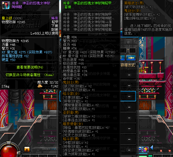 | 鬼剑士 | 神枪手 | 格斗家 | 魔法师 | 圣职者 | 暗夜使者 | 布甲 | 皮甲 | 重甲 | 轻甲 | 板甲 | 饰品 |