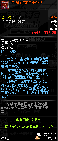 | 85 | 牛头统帅的兽王骨甲 | *牛头统帅 掉落(魂:比尔马克帝国试验场 3图) *设计图(魂:比尔马克帝国试验场 登场的NPC加百利 出售) |