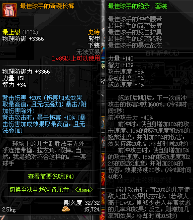 | 85 | 最佳球手的奇袭长裤 | *Lv84~91深渊地下城怪物掉落 | 最佳球手的绝杀 套装 | |