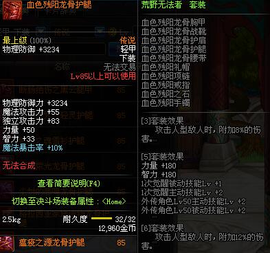 | 85 | 血色残阳龙骨护腿 | *昨日之巴斯顿 掉落 (在远古地下城里出没。) *从NPC鲁特的物品店出售的[血色残阳防具礼盒]中获得 |