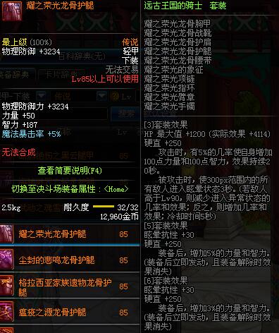 | 85 | 耀之荣光龙骨护腿 | *昨日之巴斯顿 掉落 (在远古地下城里出没。) *从NPC鲁特的物品店出售的[耀之荣光防具礼盒]中获得 |