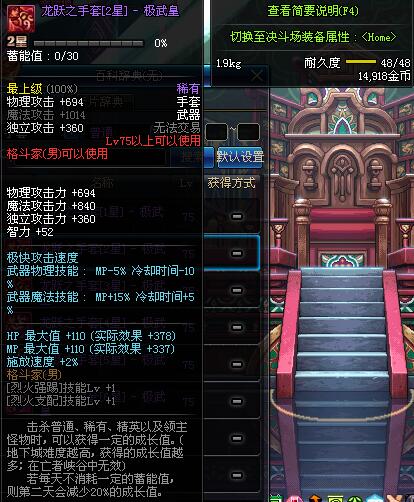| 75 | 龙跃之手套[2星] - 极武皇 | *完成二次觉醒任务后可以从NPC小铁柱处获得此道具。 | ||
