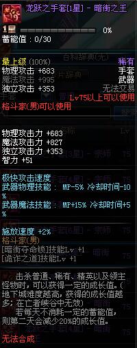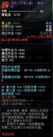 | 75 | 龙跃之手套[2星] - 暗街之王 | *完成二次觉醒任务后可以从NPC小铁柱处获得此道具。 | ||