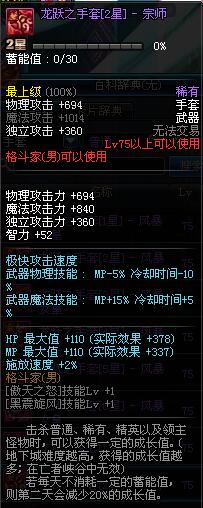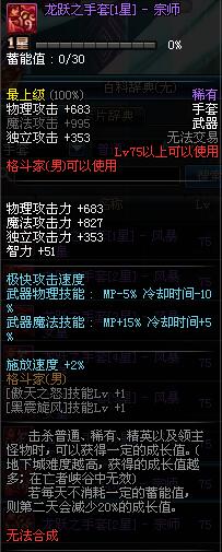 | 75 | 龙跃之手套[1星] - 宗师 | *完成二次觉醒任务后可以从NPC小铁柱处获得此道具。 | ||