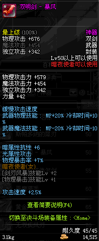 | 50 | 双明剑 - 暴风 | *Lv50~56普通地下城怪物掉落 *在加百利的神秘商店购买 |