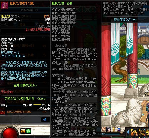 | 85 | 瘟疫之源獠牙战靴 | *昨日之巴斯顿 掉落 (在远古地下城里出没。) *从NPC鲁特的物品店出售的[瘟疫之源防具礼盒]中获得 |