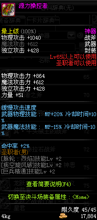 | 65 | 源力操控者 | *Lv65~71普通地下城怪物掉落 *在加百利的神秘商店购买 |