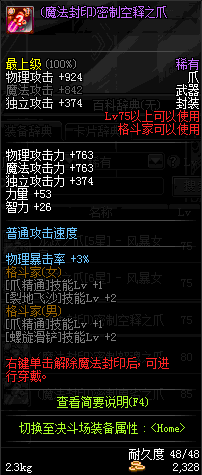 | 75 | (魔法封印)密制空释之爪 | *Lv75~81普通地下城怪物掉落 *完成[调查紫雾团]任务 *使用Lv75~81怪物掉落的设计图进行制作 |