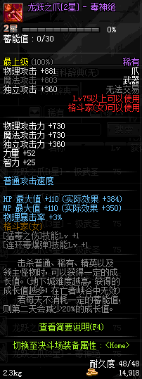 | 75 | 龙跃之爪[2星] - 毒神绝 | *完成二次觉醒任务后可以从NPC小铁柱处获得此道具。 | ||