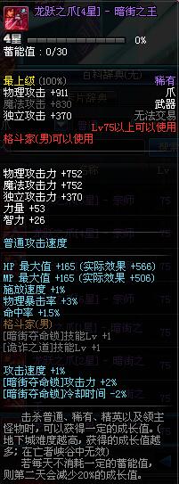 | 75 | 龙跃之爪[1星] - 暗街之王 | *完成二次觉醒任务后可以从NPC小铁柱处获得此道具。 | ||