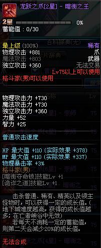 | 75 | 龙跃之爪[2星] - 暗街之王 | *完成二次觉醒任务后可以从NPC小铁柱处获得此道具。 | ||